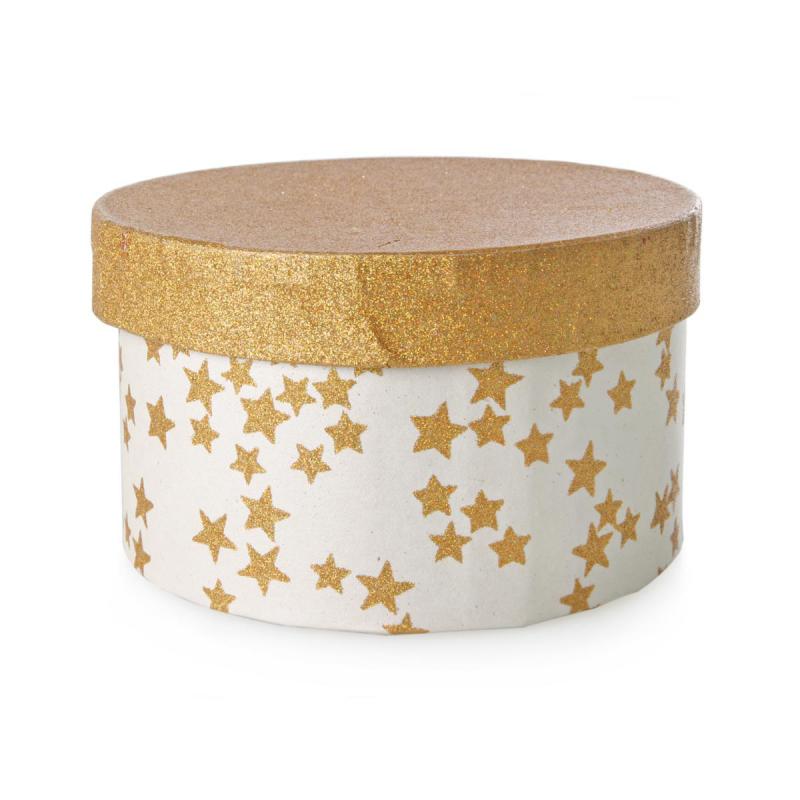 Die runde Geschenkbox mit goldenem Deckel, der mit funkelnden Sternen in Gold bedruckt ist, verleiht jedem Geschenk eine edle und festliche Note. Sie eignet sich ideal für besondere Anlässe wie Weihnachten oder Geburtstage und bietet eine stilvolle Möglichkeit, kleine Präsente elegant zu verpacken.