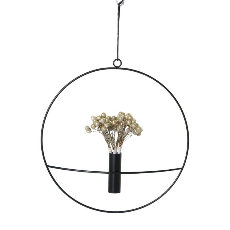 Eleganter schwarzer Metallring mit Vaseneinsatz – ein stilvolles Wohnaccessoire für moderne Einrichtungen. Perfekt für hängende Blumen- und Pflanzendekorationen. Der Metallring sorgt für Stabilität, während der Vaseneinsatz Ihre Kunstwerke sicher präsentiert. Vielseitig verwendbar in Wohn- und Arbeitsräumen. Verleihen Sie Ihrem Interieur einen Hauch von Minimalismus und Eleganz. Ideal als Geschenk für Designliebhaber. Ein Highlight für jeden Raum. Maße: Durchmesser 30 cm.