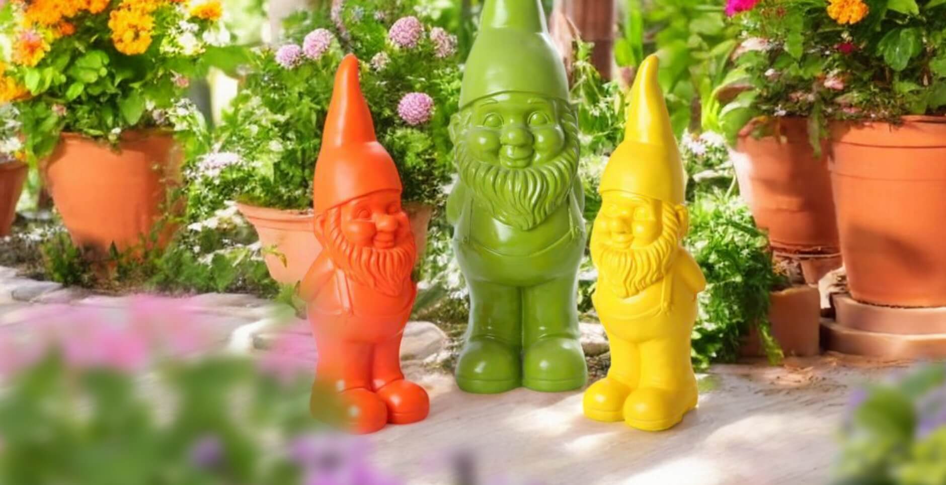 Begeistern Sie Ihre Kunden mit farbenfrohen Gartenfiguren wie Zwergen in knallbunten Farben, glänzenden Gartenkugeln in gold, silber und multicolor, sowie bepflanzbaren Fahrzeugen als kreative Hingucker.