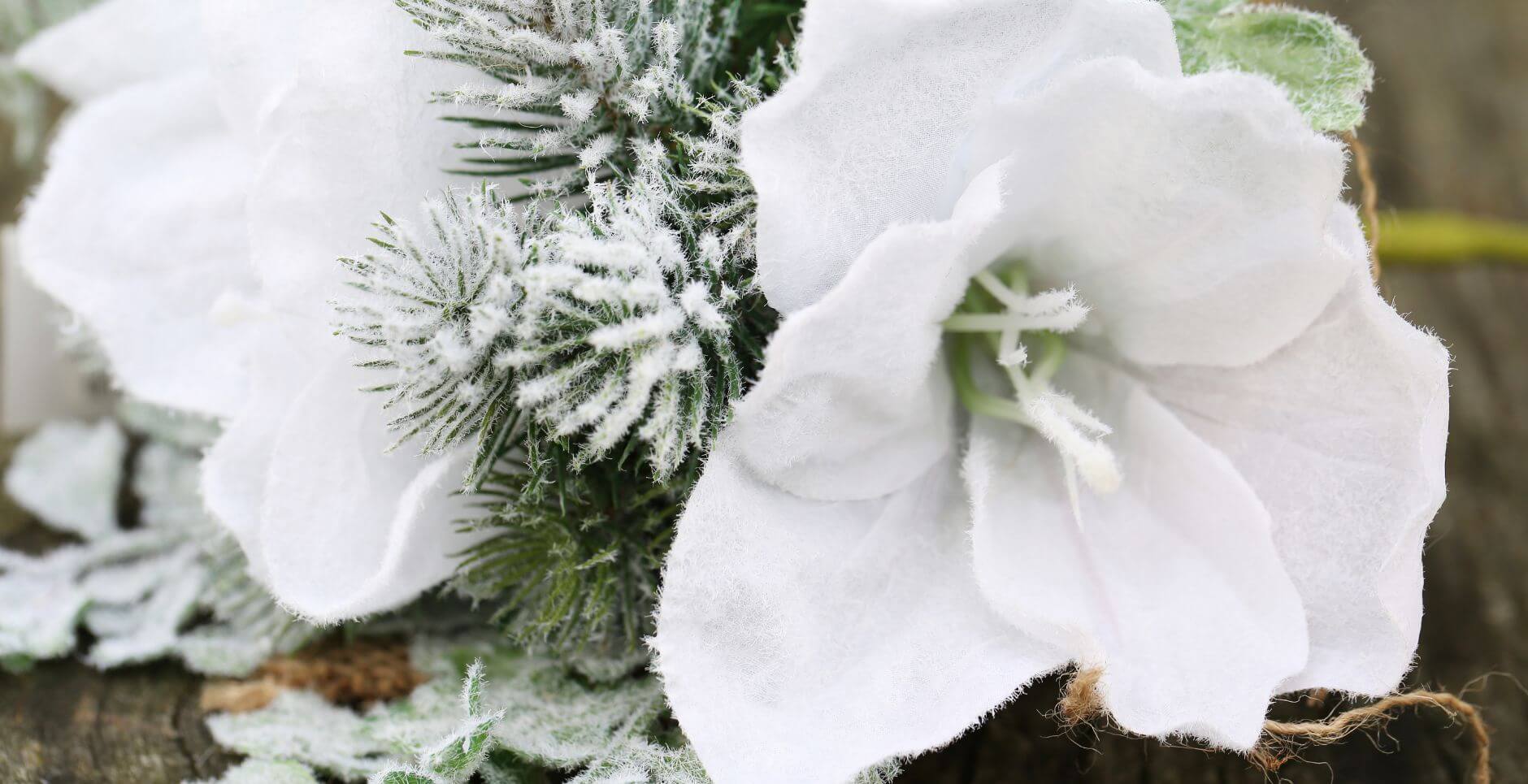 Winterliche Seidenblumen mit Beflockung und frostigen Details